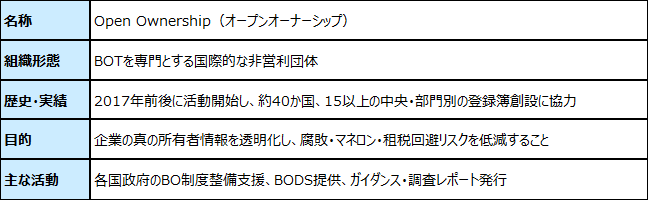 Open Ownershipは、各国における「実質的支配者の透明性(Beneficial Ownership Transparency/BOT)」を推進することを目的とした国際的な非営利組織です。同団体の活動は、大きく3つの柱に整理できます。第一に、各国政府に対する制度設計支援です。実質的支配者情報をどのような枠組みで収集・管理し、誰にどこまで公開するのか、といった論点について、法制度・運用設計のガイダンスを提供しています。第二に、実質的支配者情報のデータ標準化です。Open Ownershipは「実質的支配者データ標準(Beneficial Ownership Data Standard/BODS)」と呼ばれるデータ仕様を策定し、各国の実質的支配者登録簿が相互運用性を高められるような共通言語の整備を進めています。第三に、各種レポートやワーキングペーパーを通じた知見の発信です。本稿で扱うワーキングペーパーも、その一つに位置付けられます。
